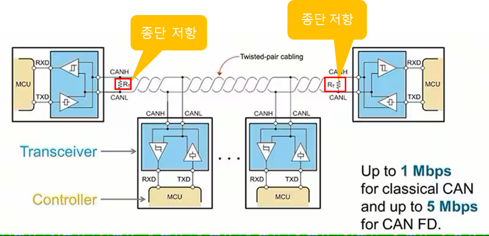 - 버스 선의 끝에는 CANH와 CANL를 연결하는 120 Ohm의 종단 저항이 있다. (버스 별로 1쌍이 존재한다.)