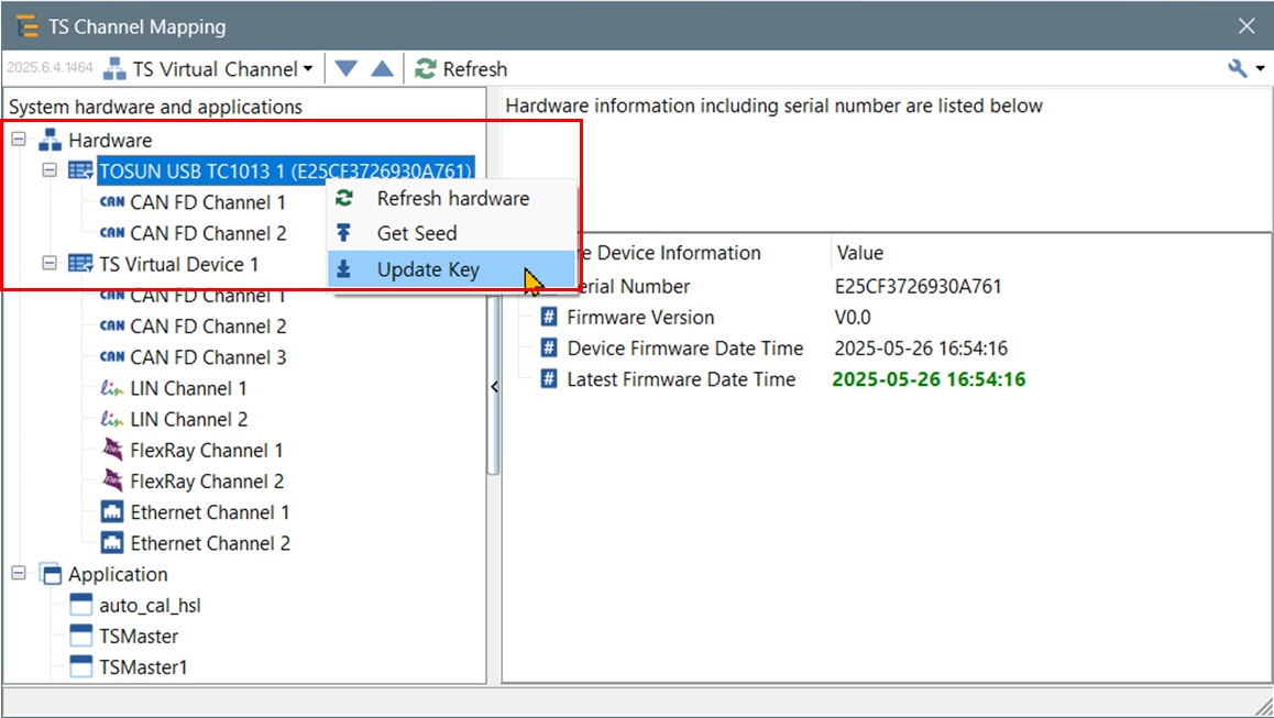 - TS Channel Mapping 창의 왼쪽 영역에서 해당 하드웨어를 선택한다. 마우스 우클릭하여 Update Key를 실행한다. 키 파일을 선택한다.