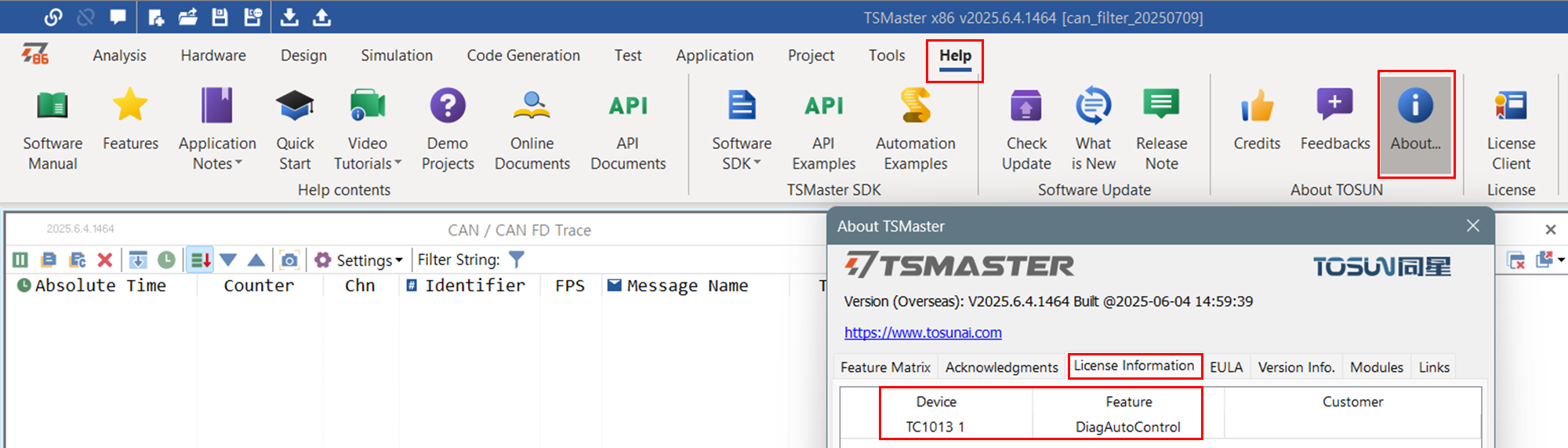 - 메인 메뉴/ Help/ About을 클릭하여 About TSMaster 창을 연다.