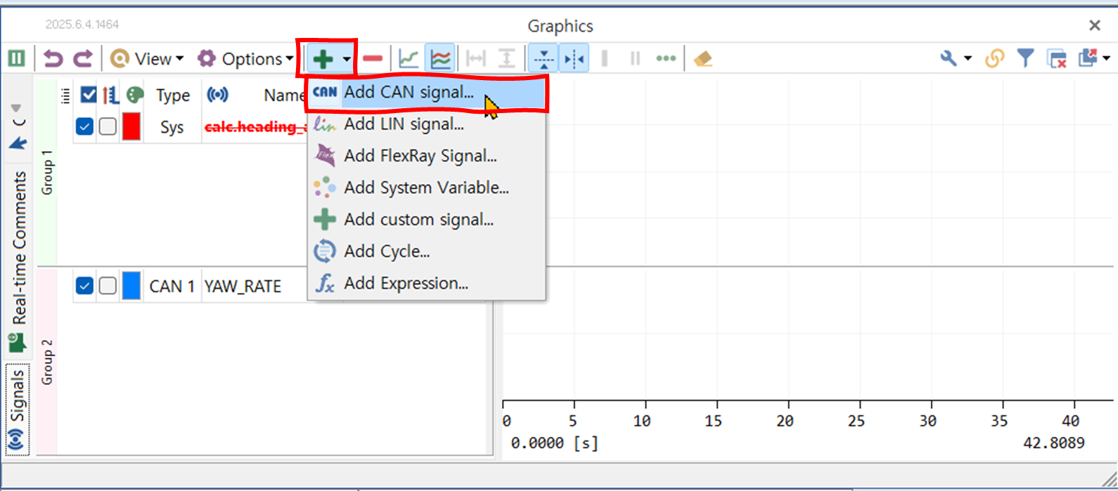 그래픽스 창에서 '+' 기호 아이콘을 클릭하여, Add CAN signal...을 선택한다.