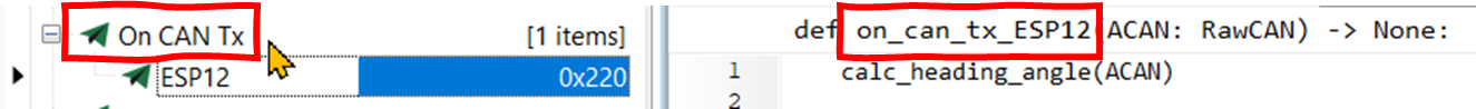 - 같은 방법으로 On CAN Tx 이벤트에서도 calc_heading_angle(ACAN)을 호출하도록 한다.