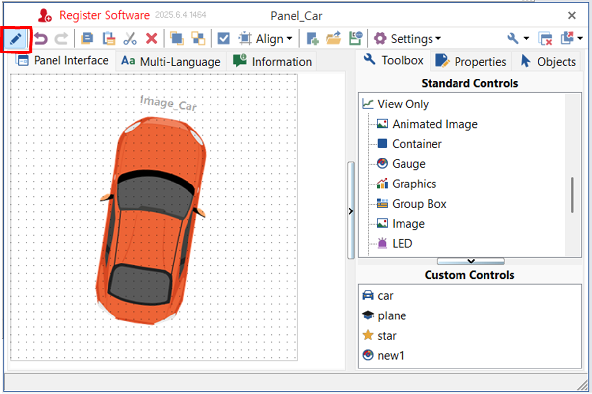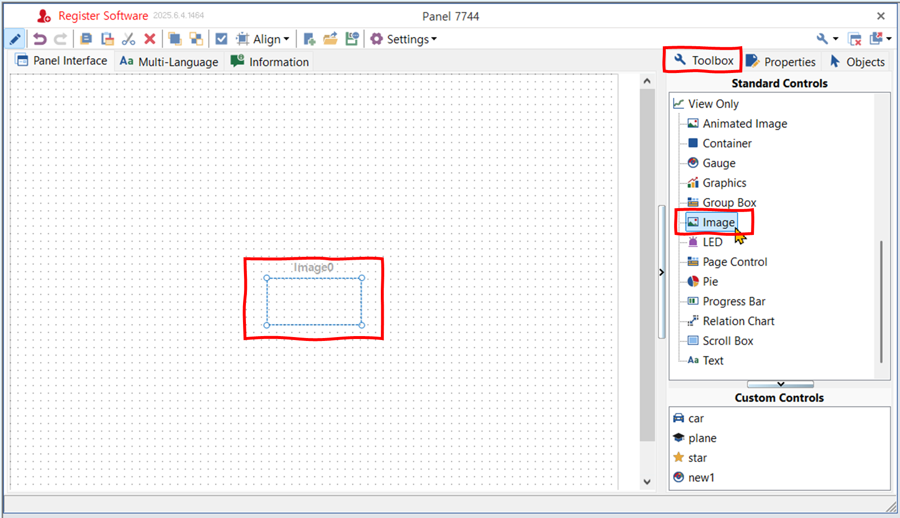 메인 메뉴/ Simulation/ Panel에서 새 판넬을 추가하거나 기존 판넬을 선택한다. - 판넬 창의 오른쪽 영역에서 Toolbox 탭을 선택한다. Image 아이콘을 더블 클릭하여, 캔버스에 이미지 콘트롤을 추가한다. 이미지 콘트롤을 드래그하여 위치를 옮긴다. 꼭지점을 클릭한 채로 드래그하여 크기를 변경한다.