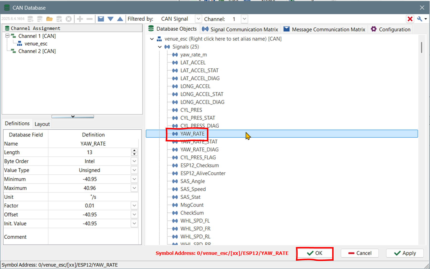 CAN Database 창이 뜨면, YAW_RATE를 선택한다. - 그래픽스 창에 시스템 변수 추가하는 것도 위와 같은 방식이다. 차이가 있다면 미니프로그램을 실행하지 않은 상태에서는 시스템 변수 창에 선택할 시스템 변수가 없다는 점이다.