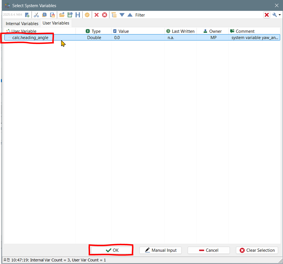 미니프로그램을 실행하면 시스템 변수 창에 calc.heading_angle 시스템 변수가 표시된다.