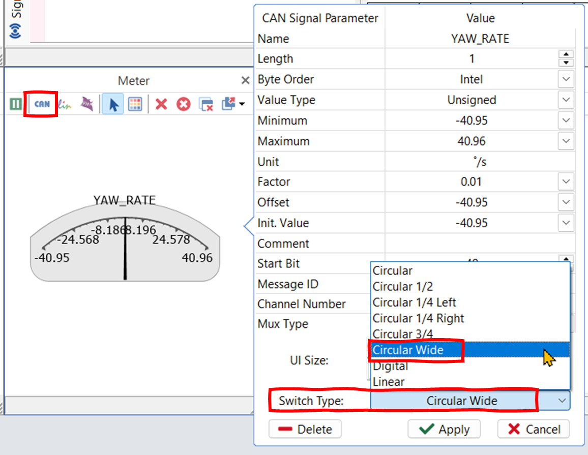 - Meter 창에서 CAN 버튼을 클릭하여 YAW_RATE 신호를 추가한다. 게이지가 추가된다. 게이지를 더블 클릭하면 설정창이 열린다. 게이지 표시 범위, 모양 등을 설정할 수 있다.
