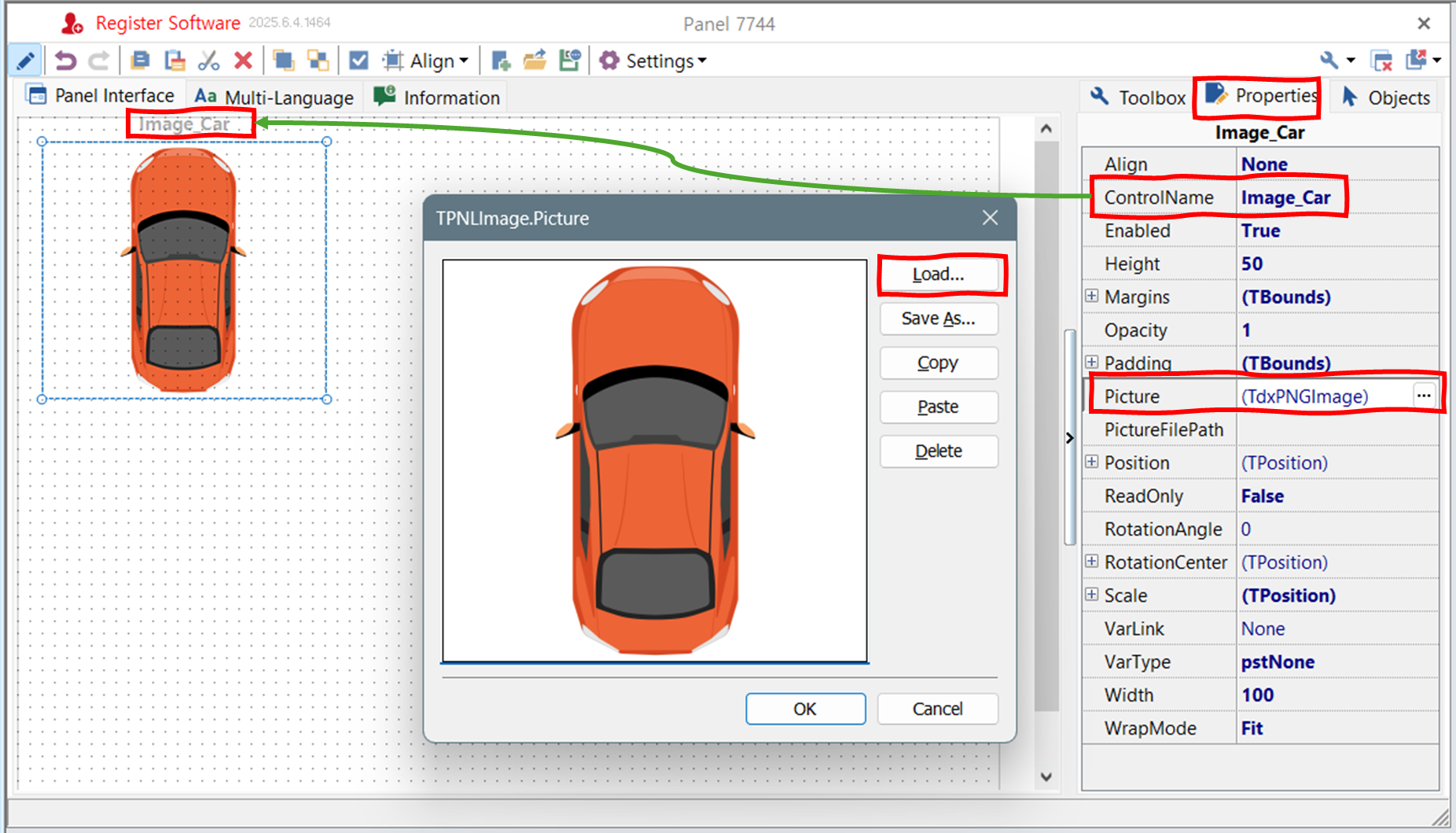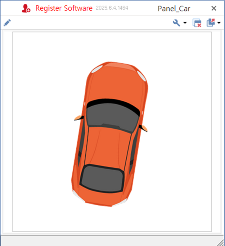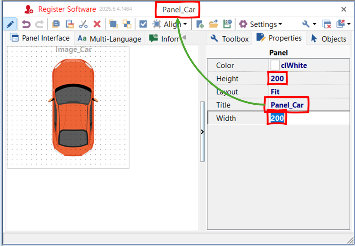 ControlName을 변경하고, 그림 파일을 로드한다. - 캔버스의 빈 곳을 클릭하여 판넬을 선택한다. Title을 'Panel_Car'로 변경한다. Height와 Width도 이미지 크기에 맞게 조절한다. 이 크기가 판넬을 실행할 때 윈도의 크기가 된다.