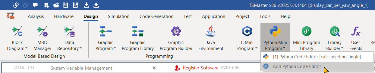 - 메인 메뉴/ Design/ Python Mini Program을 클릭하고 Add Python Code Editor를 선택하여 파이썬 코딩 창을 연다.