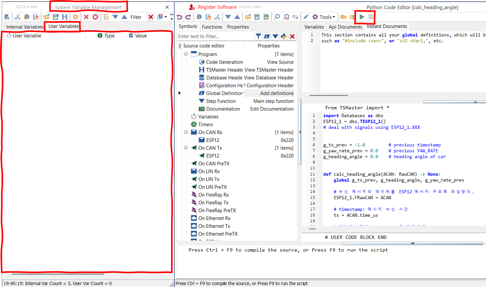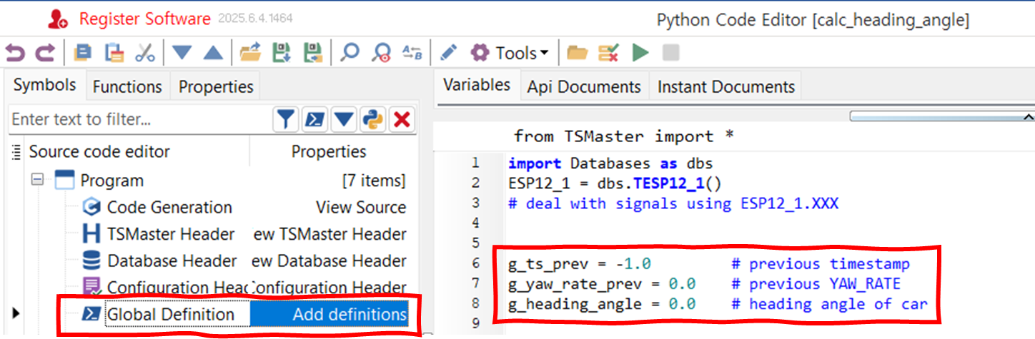 def on_start_create_sys_vars() -> None: if app.create_system_var('calc.heading_angle', TSystemVarType_svtDouble, '0.0', 'system variable yaw_angle') == 0: app.log_text('created', lvlOK) def on_stop_delete_sys_vars() -> None: if app.delete_system_var("calc.heading_angle") == 0: app.log_text("deleted", lvlOK)글로벌 변수 선언