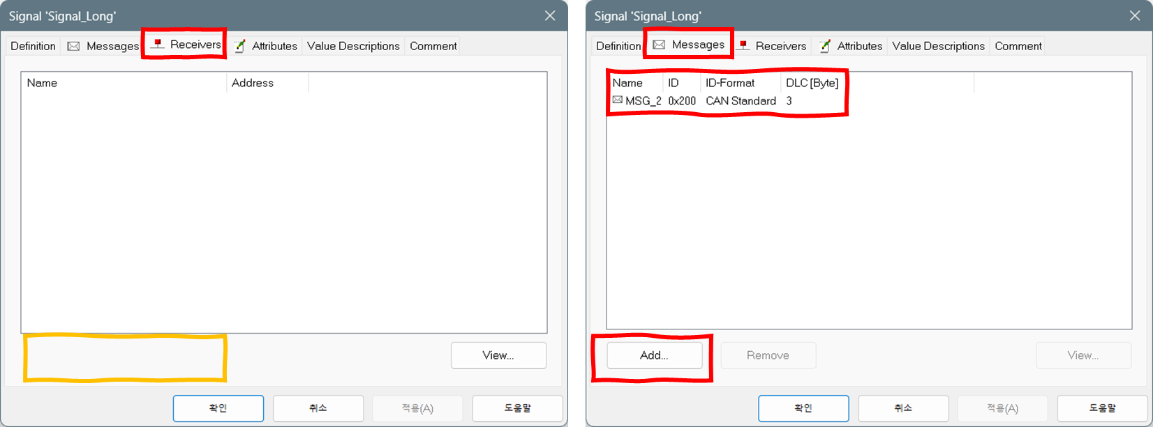 - CAN은 한 신호에 여러 수신 제어기들이 있다. Receivers 탭에 Add와 Remove 버튼이 있어서, 이 버튼들을 이용하여 수신 제어기들을 추가, 삭제할 수 있어야할 것 같은데 ... 두 버튼들이 없다.