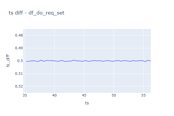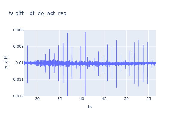 # 두 신호를 각각 numpy array로 변환 do_req_set = trace['CAN1_TIO9011_N01_SET_DO_LEVEL_REQ_TIO9011_IO_LEVEL'][:] do_act_req = trace['CAN1_TIO9011_N01_REP_DI_LEVEL_TIO9011_CH9_Level'][:]# timestamp가 동일한지 확인한다. # 동일하지 않으면, 하나의 df로 만들 수 없다. print(f'{do_req_set.shape = } {do_act_req.shape = }') print(f'{(do_req_set.shape == do_act_req.shape) = }') try: print(f'{(do_req_set[0] == do_act_req[0]).all() = }') except ValueError as e: print("ValueError:", e)do_req_set.shape = (2, 44) do_act_req.shape = (2, 2966) (do_req_set.shape == do_act_req.shape) = False ValueError: operands could not be broadcast together with shapes (44,) (2966,)# 두 신호를 각각의 DataFrame으로 만든다. df_do_req_set = pd.DataFrame(do_req_set.T, columns=['ts', 'do_req_set']) # 신호가 1개의 경우 Transpose를 해야한다. df_do_act_req = pd.DataFrame(do_act_req.T, columns=['ts', 'do_act_req']) # 신호가 1개의 경우 Transpose를 해야한다.print(df_do_req_set.ts.diff().describe()) df_do_req_set.head(3)count 43.000000 mean 0.500017 std 0.000298 min 0.499481 25% 0.499767 50% 0.499997 75% 0.500323 max 0.500507 Name: ts, dtype: float64ts do_req_set 0 34.738190 0.0 1 35.238565 1.0 2 35.738881 0.0 print(df_do_act_req.ts.diff().describe()) df_do_act_req.head(3)count 2965.000000 mean 0.010000 std 0.000156 min 0.008102 25% 0.009971 50% 0.009979 75% 0.010027 max 0.012109 Name: ts, dtype: float64ts do_act_req 0 26.998460 1.0 1 27.008549 1.0 2 27.018482 1.0 df_do_req_set['ts_diff'] = df_do_req_set['ts'].diff() px.line( df_do_req_set, x='ts', y='ts_diff', title='ts diff - df_do_req_set', range_y=[df_do_req_set.ts_diff.mean() * 1.05, df_do_req_set.ts_diff.mean() * 0.95], width= 600, height= 400, ).show() df_do_req_set.ts_diff.describe()