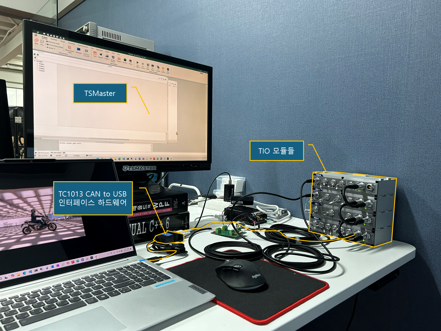 - TIO는 CAN으로 통신하는 Tosun의 Input Output 장치이다 (이름의 유래로 추측한다.). Digital IO, Analog IO, 저항, 릴레이 모듈들이 있다. 모듈들을 아래 사진처럼 TSMaster와 CAN으로 연결한다. https://tosunai.kr/hardware/category/tio-series/