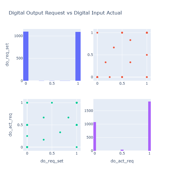 Resample 후 디지털 출력 요청과 실제 디지털 입력 신호. 틱 바이 틱으로 봐야한다. # 신호 사이의 관계를 scatter 그래프의 매트릭스로 확인한다. import plotly.figure_factory as ff fig = ff.create_scatterplotmatrix( df[['do_req_set', 'do_act_req']], diag='histogram', title='Digital Output Request vs Digital Input Actual', width=600, height=600 ) fig.show()