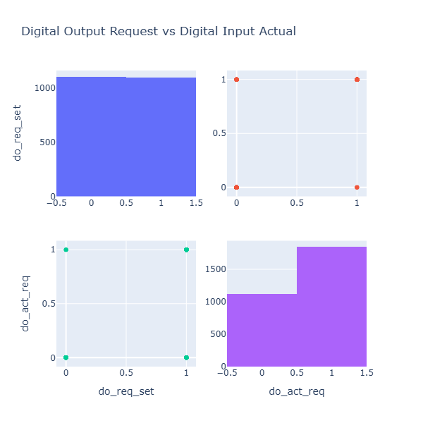 다시 resample 후 디지털 출력 요청과 실제 디지털 입력 신호. 틱 바이 틱으로 봐야한다. # 신호 사이의 관계를 scatter 그래프의 매트릭스로 확인한다. fig = ff.create_scatterplotmatrix( df[['do_req_set', 'do_act_req']], diag='histogram', title='Digital Output Request vs Digital Input Actual', width=600, height=600 ) fig.show()