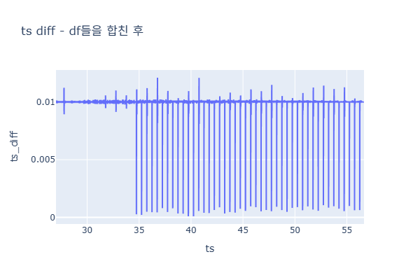 df들을 합친 후 타임스탬프의 주기가 들쭉날쭉하다. count 3009.000000 mean 0.009854 std 0.001141 min 0.000090 25% 0.009963 50% 0.009979 75% 0.010025 max 0.012109 Name: ts_diff, dtype: float64발견 - ts_diff