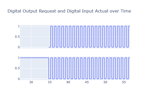 다시 resampling 한다. 타임스탬프의 주기는 10msec로 일정하다. # 'do_req_set', 'do_act_req'를 각각의 2 x 1 그래프에 그린다. fig = make_subplots(rows=2, cols=1, shared_xaxes=True) fig.add_trace(px.line(df, x='ts', y='do_req_set', title='DO Request').data[0], row=1, col=1) fig.add_trace(px.line(df, x='ts', y='do_act_req', title='DI Actual').data[0], row=2, col=1) fig.update_layout(height=400, width=600, title_text="Digital Output Request and Digital Input Actual over Time") fig.show()
