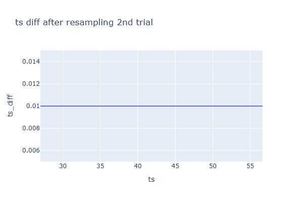 # 기존 데이터를 유지하기 위해서 복사한다. df = df_digital.copy() # ts가 초 단위 실수다. # 타임스탬프 사이의 간격을 고려하여 보간 (interpolate)하려면, # ts를 pandas의 TimedeltaIndex 형식으로 변환해야 한다. df['ts_timedelta'] = pd.to_timedelta(df['ts'], unit='s') # 0.01초(10ms) 간격으로 리샘플링 후 보간한다. df = df.resample('10ms', on='ts_timedelta').mean().interpolate() # do_req_set은 정수로 반올림한다. # do_act_req는 내림한다. # 서로 방법을 달리하는 이유는 다양한 방법이 있다는 것을 보이기 위해서다. df['do_req_set'] = df['do_req_set'].round() df['do_act_req'] = df['do_act_req'].apply(np.floor) # 타임스탬프 사이의 간격이 일정한지 확인한다. df['ts_diff'] = df.index.diff() df['ts_diff'] = df['ts_diff'].dt.total_seconds()px.line( df, x='ts', y='ts_diff', title='ts diff after resampling 2nd trial', range_y=[df.ts_diff.mean()*0.5, df.ts_diff.mean()*1.5], width=600, height=400 ).show()
