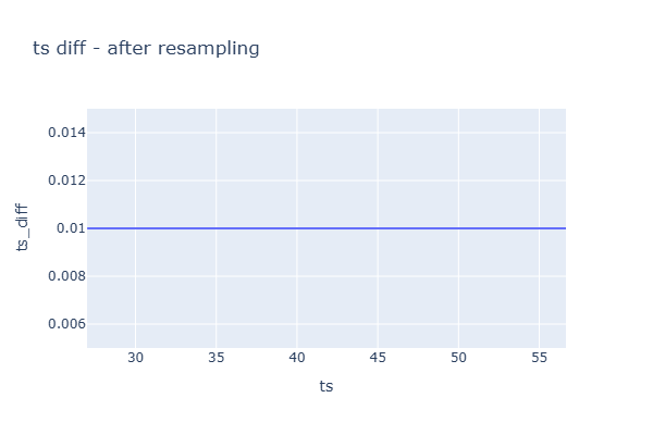 # 기존 데이터를 유지하기 위해서 복사한다. df = df_digital.copy() # ts가 초 단위 실수다. # 타임스탬프 사이의 간격을 고려하여 보간 (interpolate)하려면, # ts를 pandas의 TimedeltaIndex 형식으로 변환해야 한다. df['ts_timedelta'] = pd.to_timedelta(df['ts'], unit='s') # 0.01초(10ms) 간격으로 리샘플링 후 보간한다. df = df.resample('10ms', on='ts_timedelta').mean().interpolate() # 타임스탬프 사이의 간격이 일정한지 확인한다. df['ts_diff'] = df.index.diff() # 현재 index가 ts이다. df['ts_diff'] = df['ts_diff'].dt.total_seconds() # ts_diff를 초 단위로 변환한다. px.line( df, x='ts', y='ts_diff', title='ts diff - after resampling', range_y=[df.ts_diff.mean()*0.5, df.ts_diff.mean()*1.5], width=600, height=400 ).show() df.ts_diff.describe()