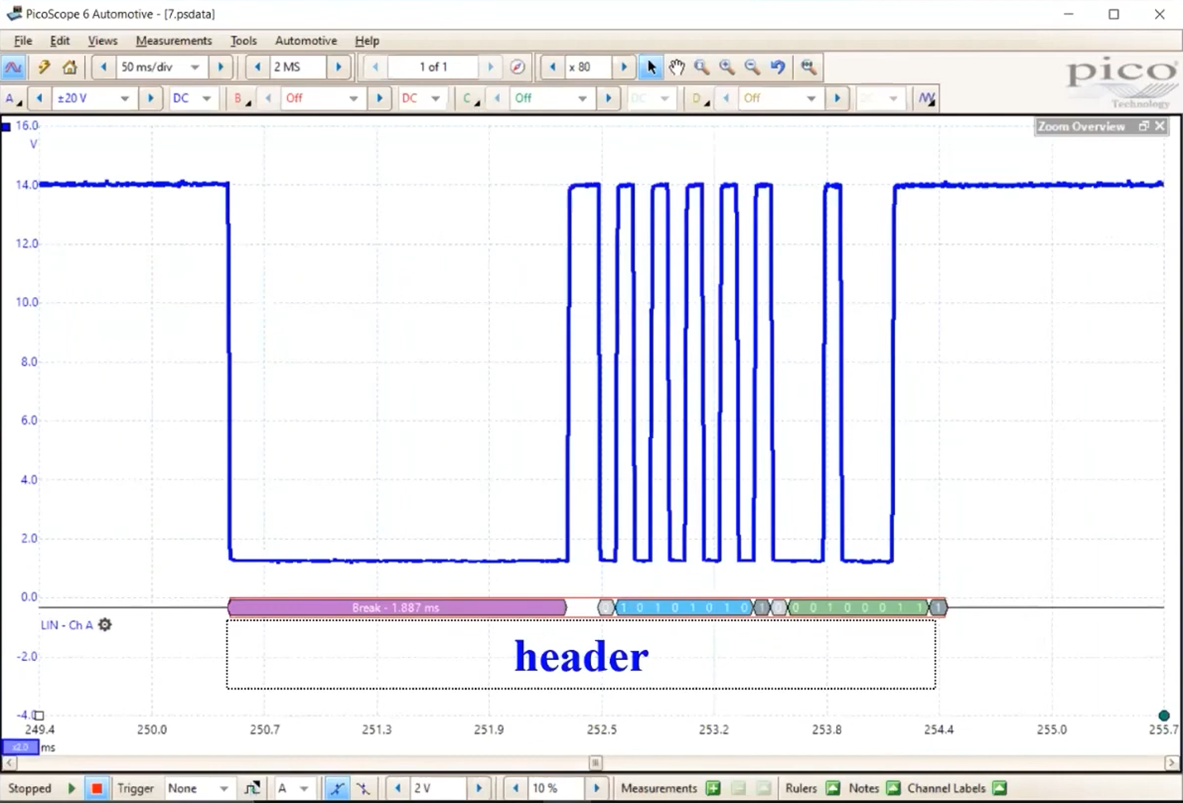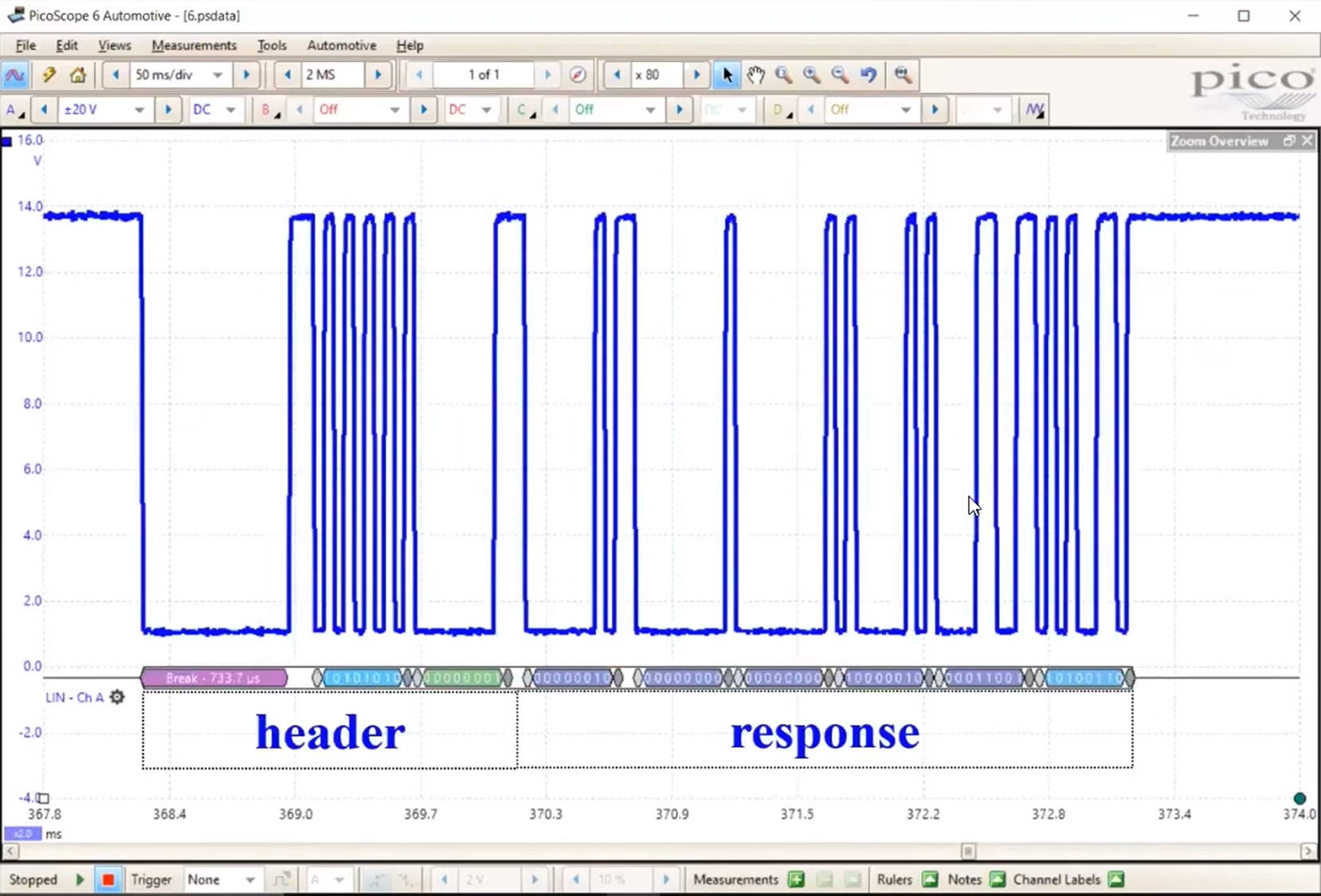 정상적인 LIN 메시지에서는 헤더와 응답을 볼 수 있다. 출처: 유튜브의 John Thornton 비디오 - 정상적인 LIN 메시지에서는 헤더와 응답을 볼 수 있다.