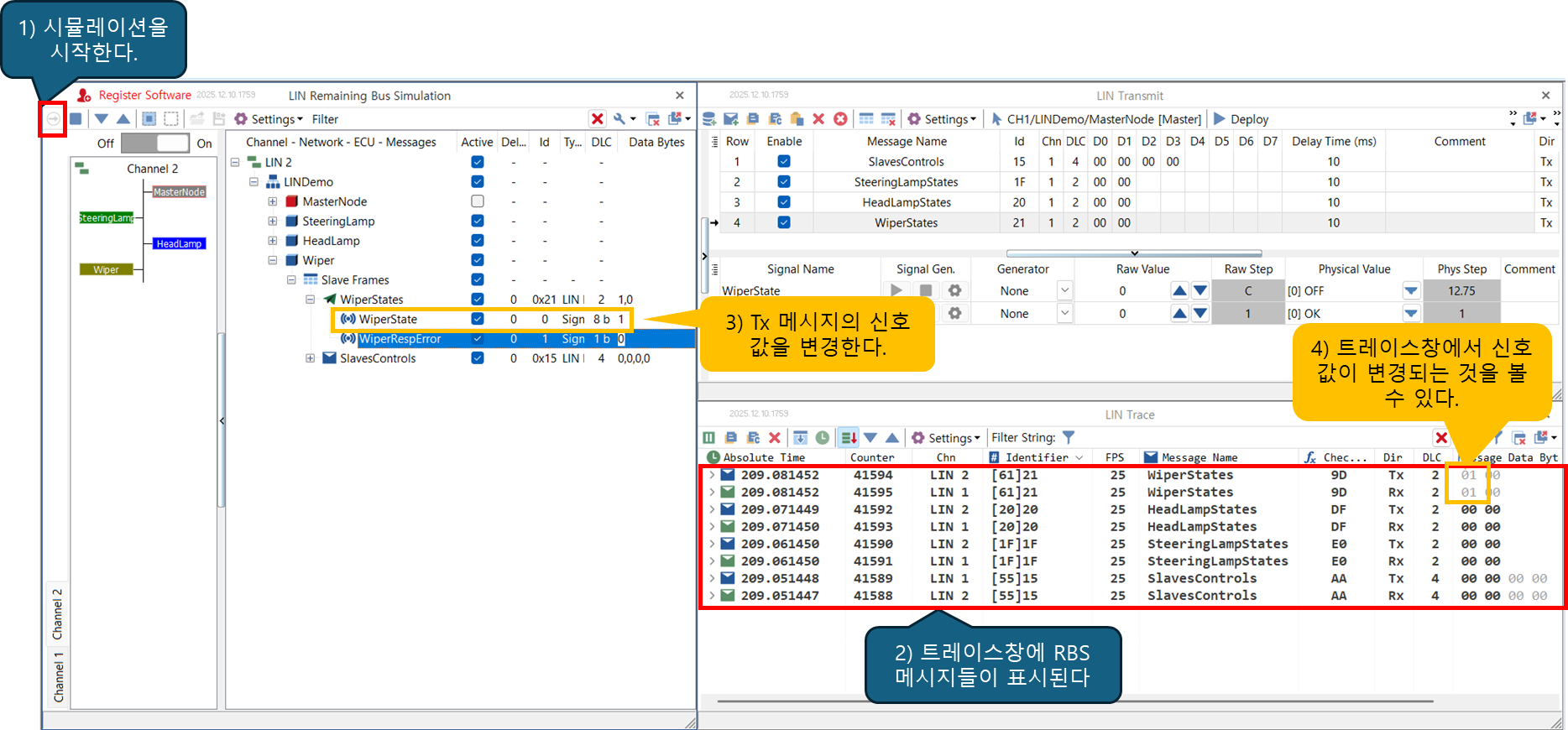 RBS창에서 LIN 메시지를 전송하는 방법을 설명하였다.