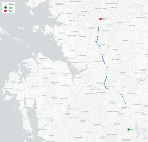 # 지도를 표시한 plolty의 Figure 오브젝트 만든다. fig = go.Figure() # Scattermapbox 기능을 이용하여 지도를 그린다. fig.add_trace(go.Scattermapbox( lat=df["latitude"], # df는 pandas의 데이터프레임이다. lon=df["longitude"], # df에는 위도(latitutde)와 경도(longtitude) 데이터가 있다. mode="markers", marker=dict( size=5, color=df[color_by], colorscale=colorscale, showscale=True, colorbar=dict(title=color_by, thickness=14), ), name="Route", customdata=df[color_by], hovertemplate=( "<b>Route</b><br>" "Lat: %{lat:.6f}<br>" "Lon: %{lon:.6f}<br>" f"{color_by}: %{{customdata:.2f}}" "<extra></extra>" ), ))코드