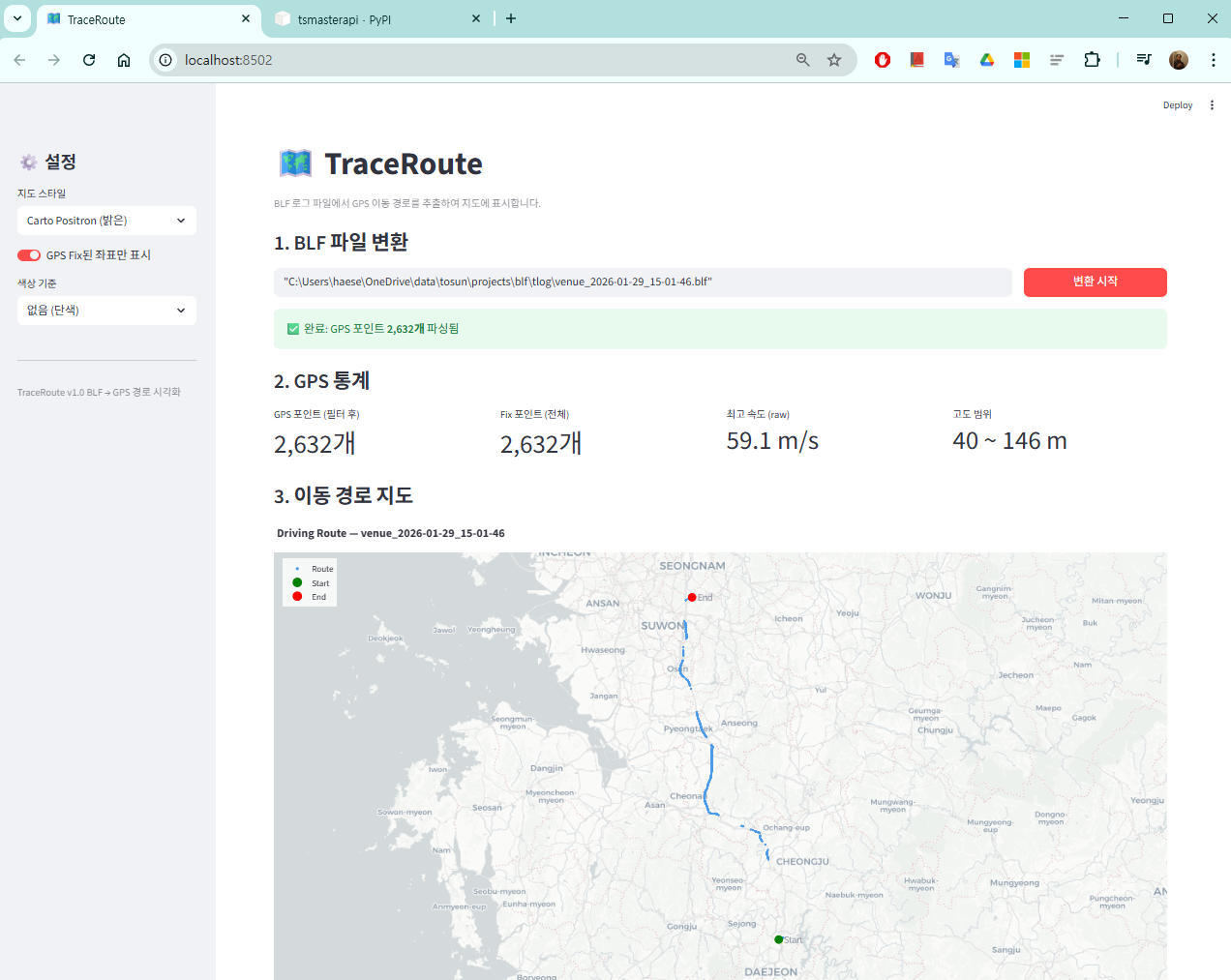 GPS 데이터 변환 오류를 수정한 후 전체 경로가 표시된다. 결론
