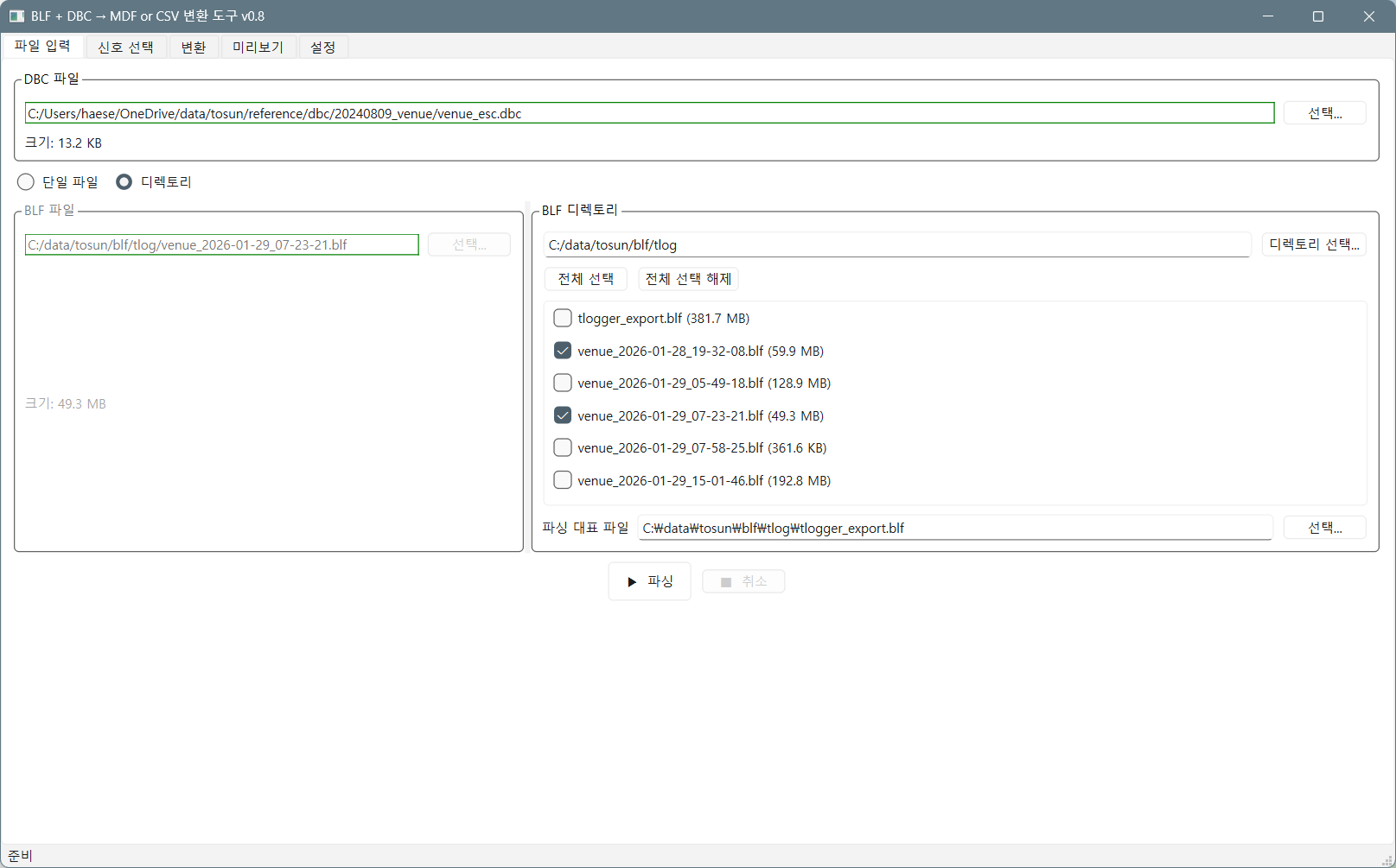 디렉토리를 선택하면, 그 디렉토리에 있는 모든 blf 파일들을 표시하여 사용자가 선택할 수 있도록 하고, 선택된 파일들을 변환하여 csv 파일들을 생성하는 기능을 추가하였다.