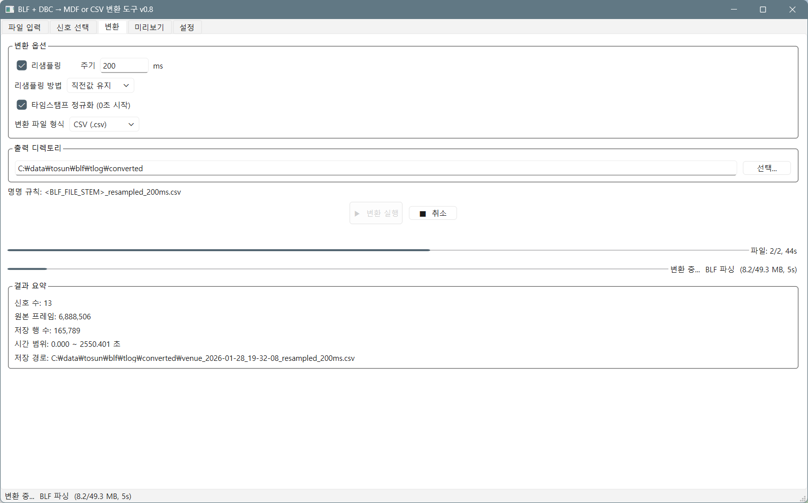 - 변환 실행을 클릭하면 변환이 시작된다. 변환 중 프로그레스바와 변환 결과 요약이 표시된다.