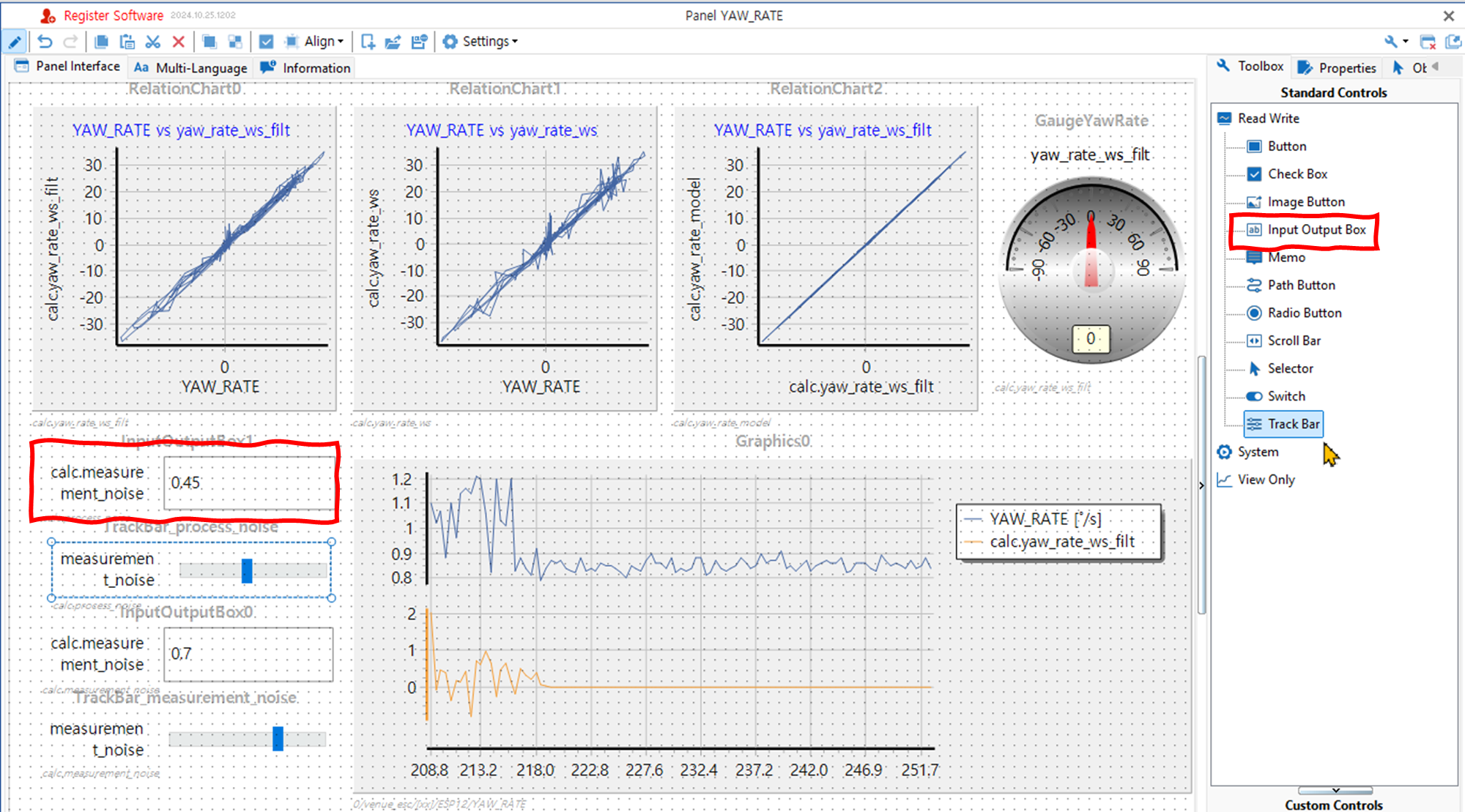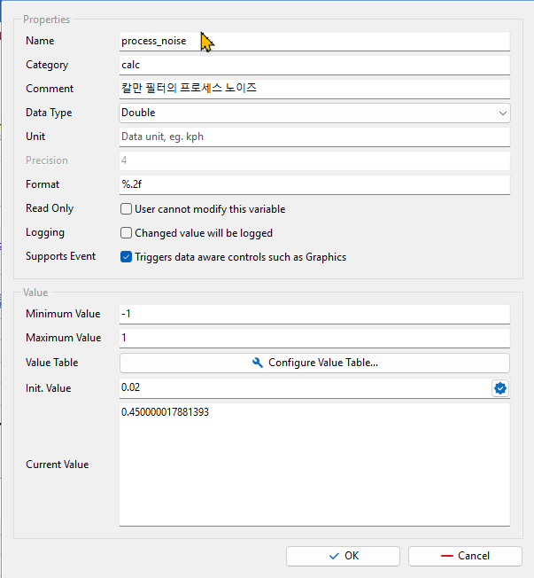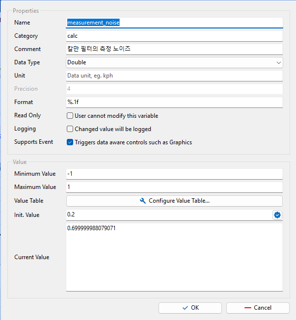 System Variable Management 창에서 시스템 변수를 만든다. - process_noise와 measurment_noise라는 변수를 만든다. (측정을 한 후여서 Current Value 칸에 수치가 입력되어 있다.)