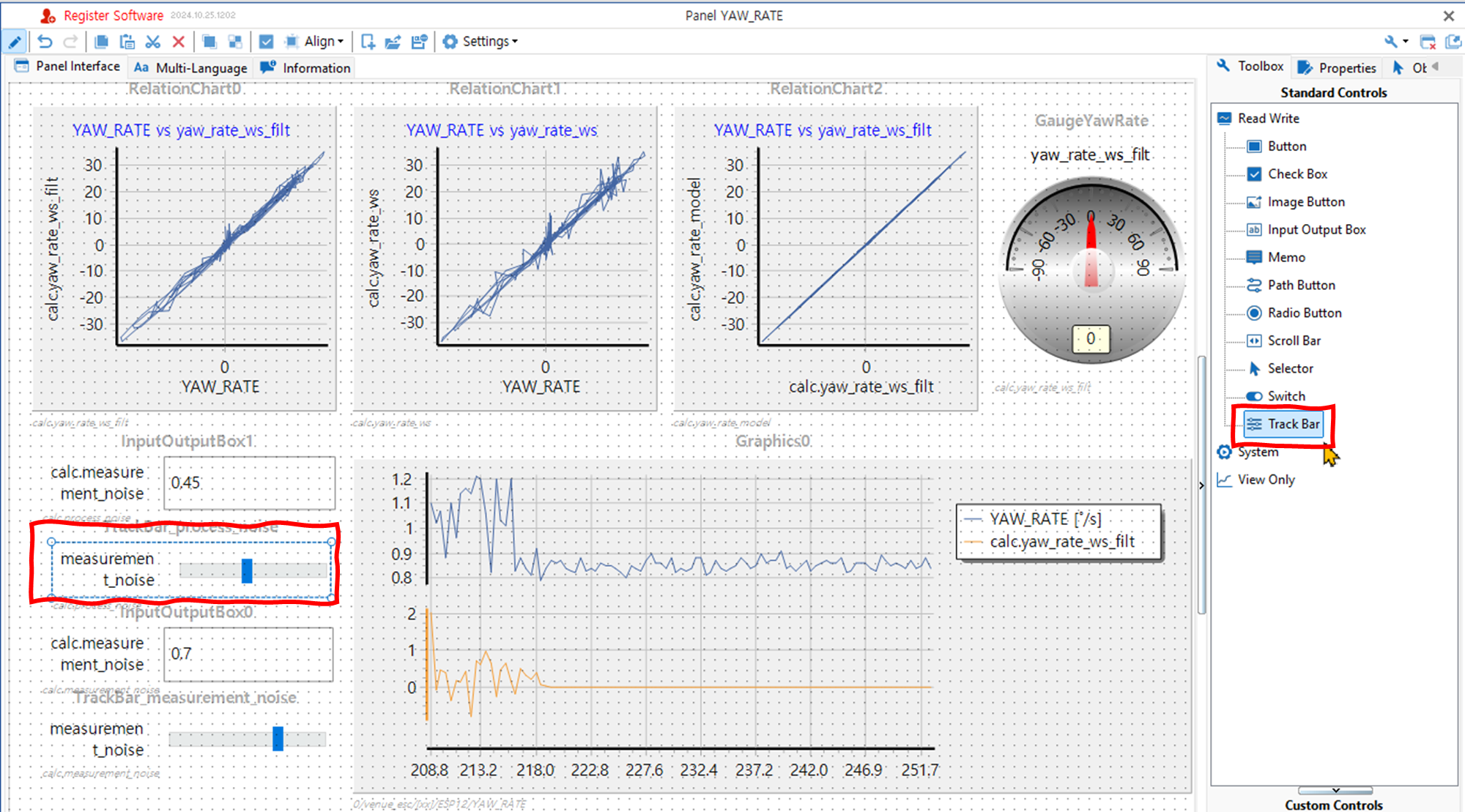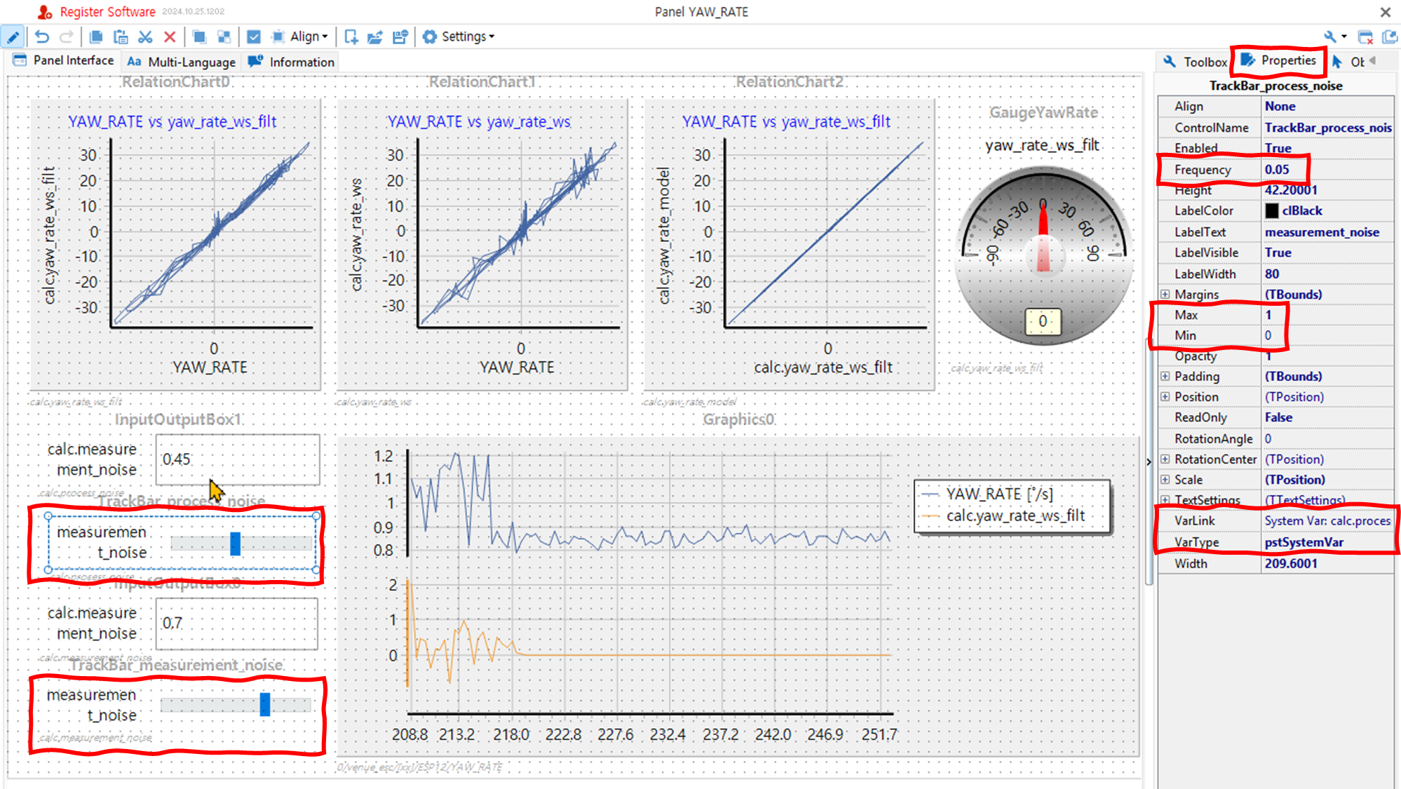 - Max, Min을 이용하여 트랙바가 표시할 최대 최소값을 설정한다. Frequency에 입력할 값의 변경 단위 (해상도)를 입력한다. 아래 그림은 시스템 변수 process_noise 를 설정한 예다. 마우스를 드래그하여 0에서 1 사이에서 0.05 스텝으로 값을 입력할 수 있다.
