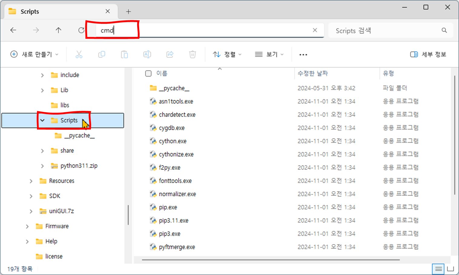 - Scripts 디렉토리에서 경로 창에 cmd 라고 입력하고 엔터 키를 누른다.