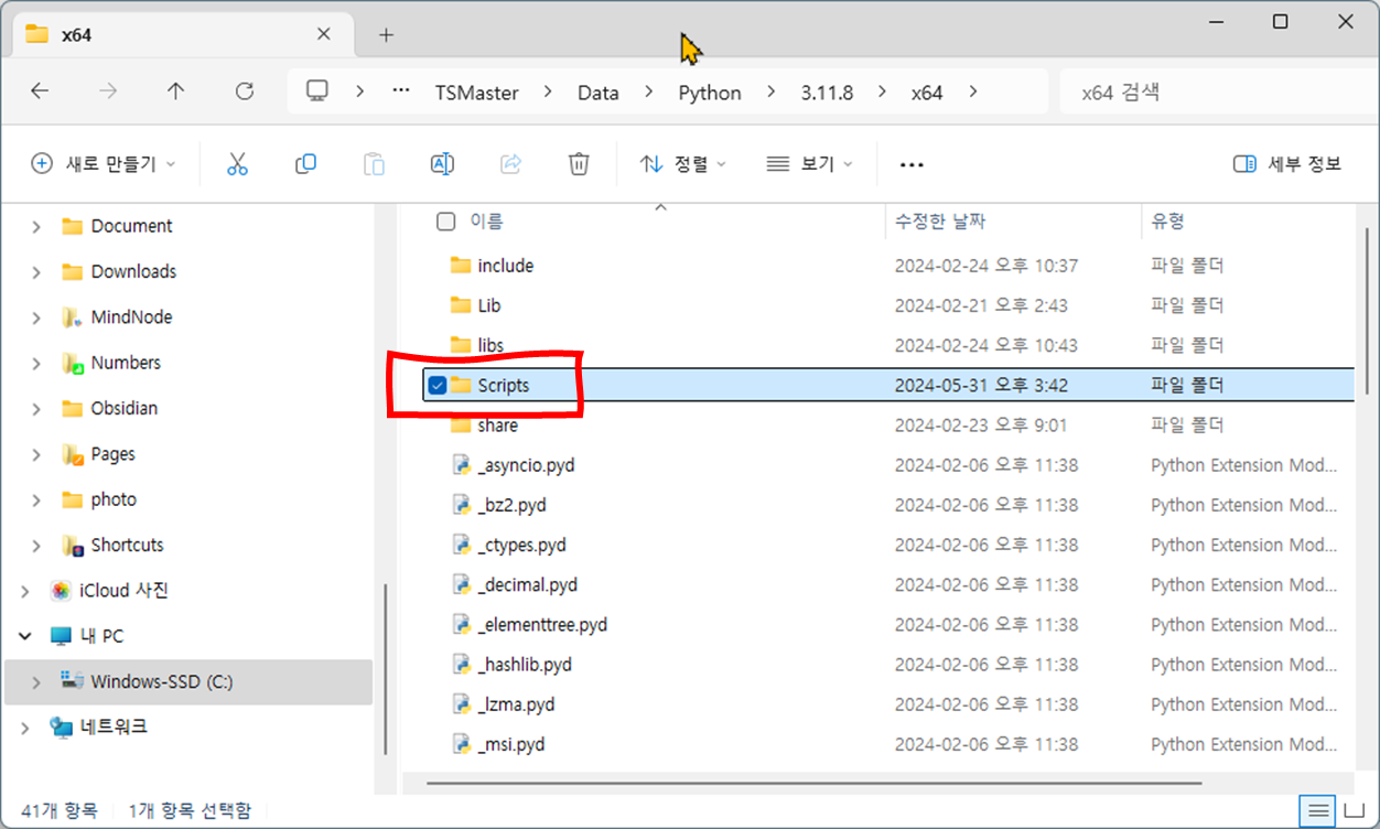 - 윈도 파일 탐색기 창이 열린다. Scripts 디렉토리로 들어간다.