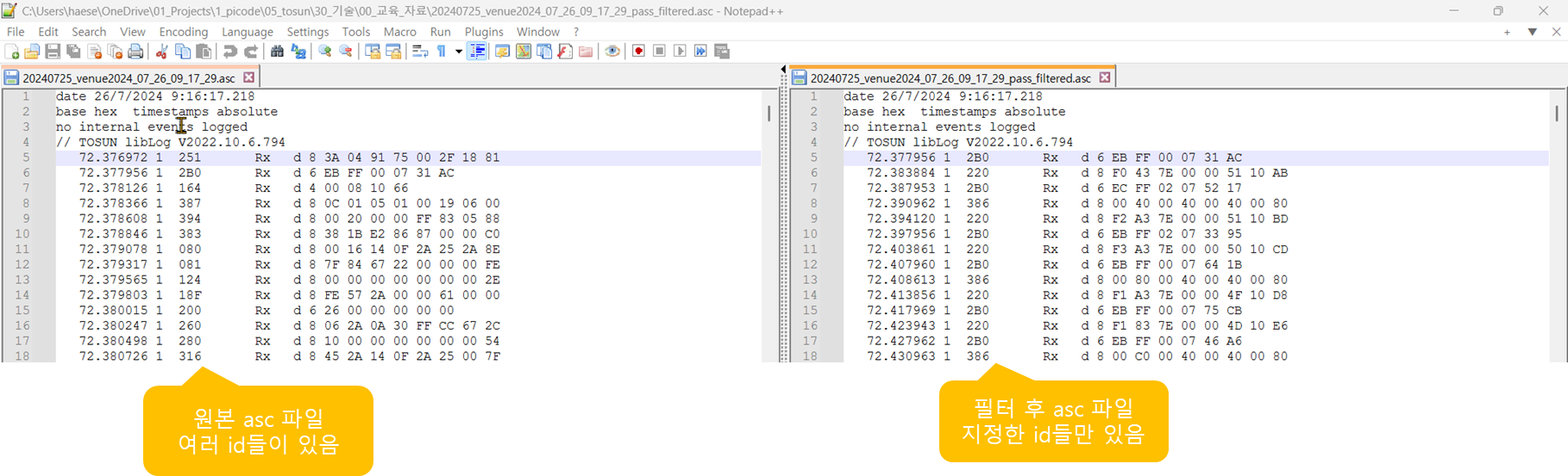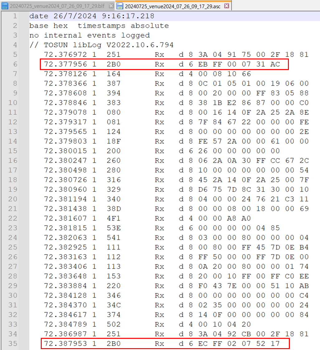 - asc 파일은 텍스트 파일이다. asc 파일의 한 줄은 TSMaster가 수신한 CAN 메시지 한 개이다. 타임스탬프, 메시지 아이디, Rx/Tx, DLC(Data Length Code), 데이터로 구성된다.