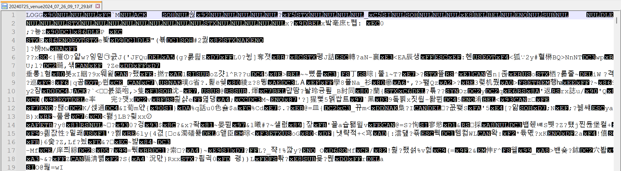 - blf는 바이너리 파일로 텍스트 에디터에서 보면 아래 그림과 같이 보인다. 내용을 알 수 없다.