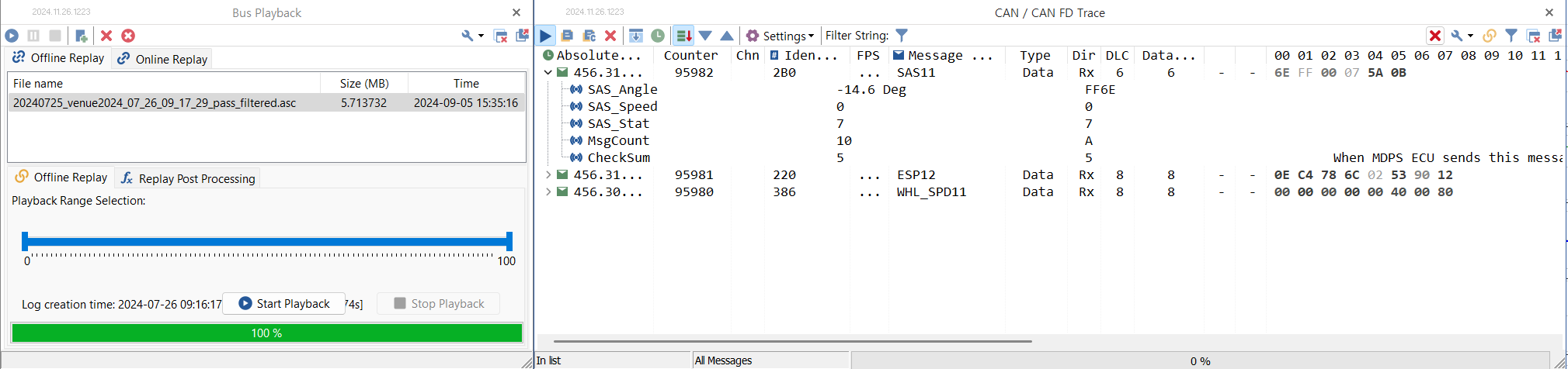 - TSMaster의 Bus Playback에서 필터된 asc 파일을 연다. (드래그&드롭하면 편리하다.)