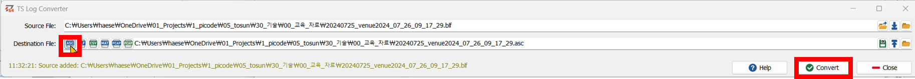 - Log Converter 창의 Source file에서 blf 파일을 선택한다. (드래그&드롭하면 편리하다.) Destination file에서 asc 버튼을 클릭한 후 Convert 버튼을 클릭한다. blf 파일이 asc로 변환된다.