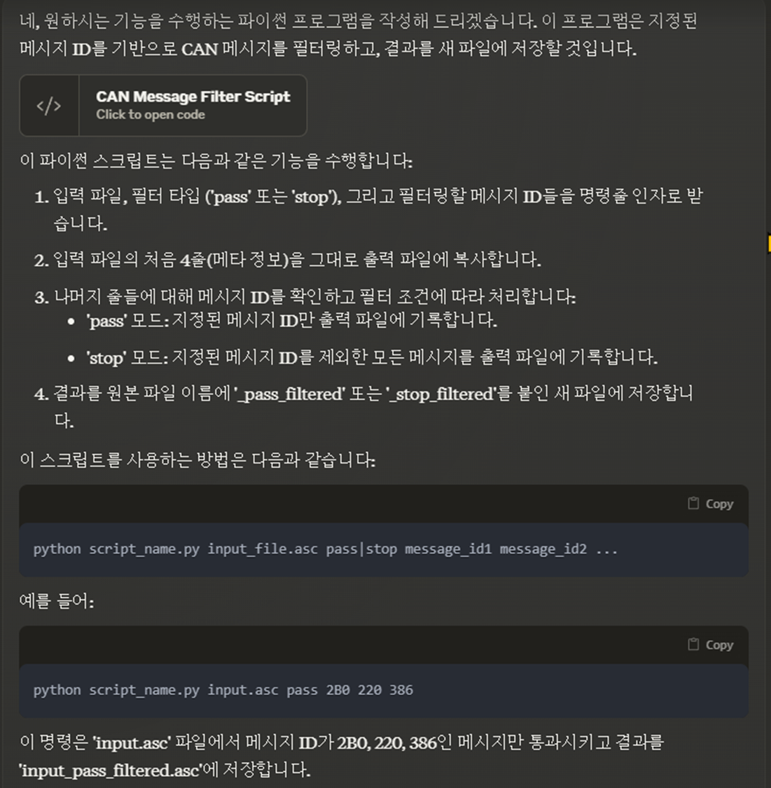 - Claude에게 asc 파일에서 지정한 메시지 아이디들을 pass/stop 필터하는 스크립트 작성을 요청한다.