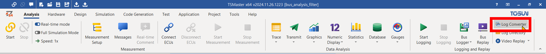 텍스트 에디터로 본 blf 파일 - 메인 메뉴/ Analysis/ Log Converter 버튼을 클릭하여 Log Converter 창을 연다.