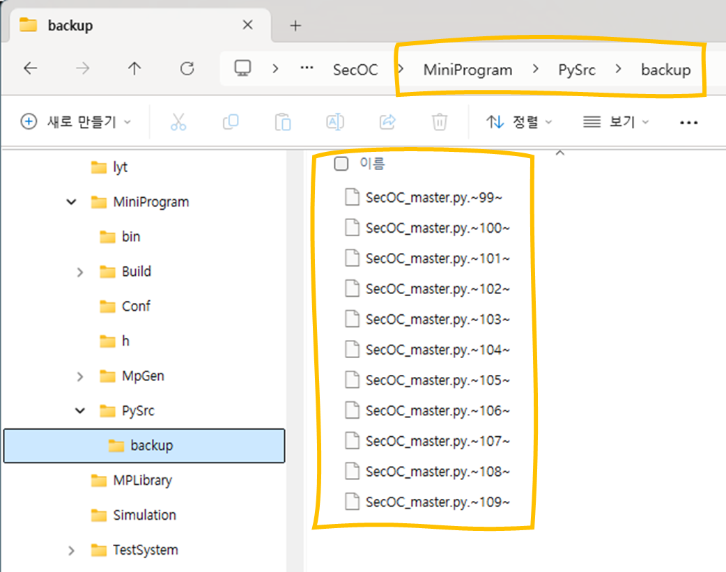 - 2. 프로젝트 디렉토리/MiniProgram/PySrc/backup 디렉토리에 최근 코드가 ".~번호~" 파일로 남아있다. 이 파일ㅇ르 텍스트 에디터로 열면 최근 코드를 볼 수 있다.