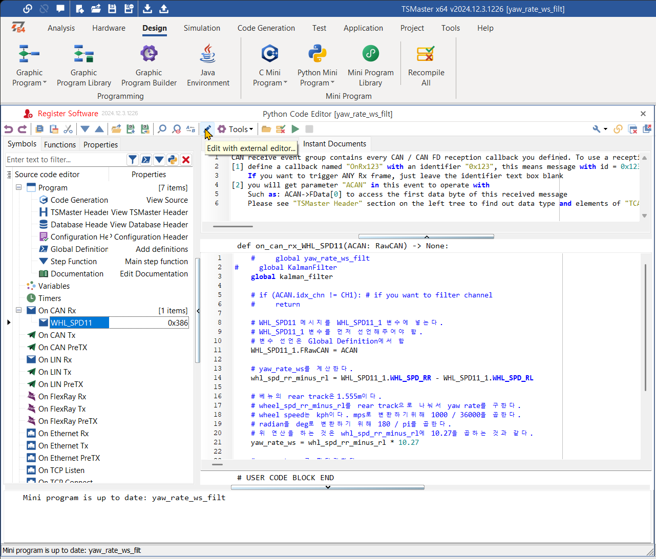 Copilot의 도움으로 코딩 속도가 높아졌다. Claude의 도움도 많이 받는다. - TSMaster의 Python Code Editor에서 Edit with external editor 버튼을 클릭하면 VS Code가 열린다. 이렇게 VS Code를 연 경우, VS Code에서 변경 내용을 "저장"하면 TSMaster의 Python Code Editor에 코드가 업데이트된다.