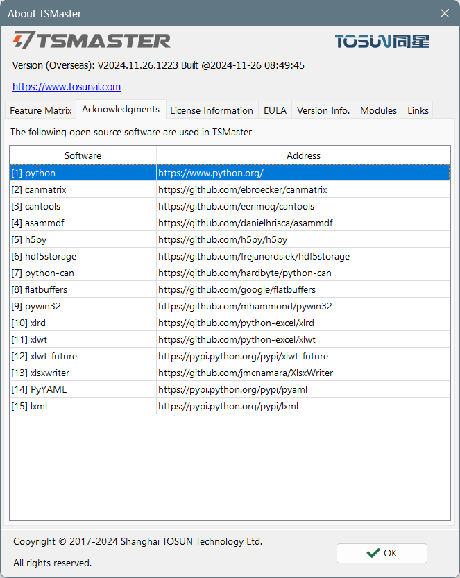 - TSMaster의 메인 메뉴/ Help/ About/ Acknowledgements를 보면 TSMaster는 아래 파이썬 모듈들을 사용한다.