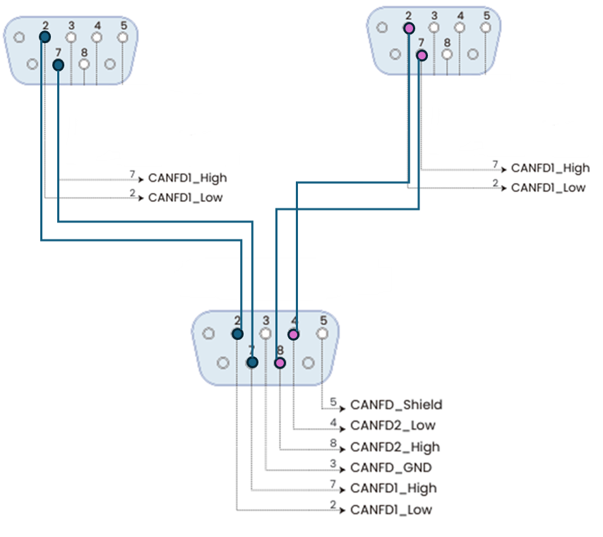 D-sub 9 커넥터에 CAN이 2 채널 포한된 경우 핀 배열 두 채널을 동시에 사용하기 위해서는 아래 그림과 같이 (2, 7)번 핀들을 (2, 7)번 핀들로, (4, 8)번 핀들도 (2, 7)번 핀들로 분기하는 케이블이 필요하다. 이 분기 케이블을 흔히 Y-케이블이라고 부른다.