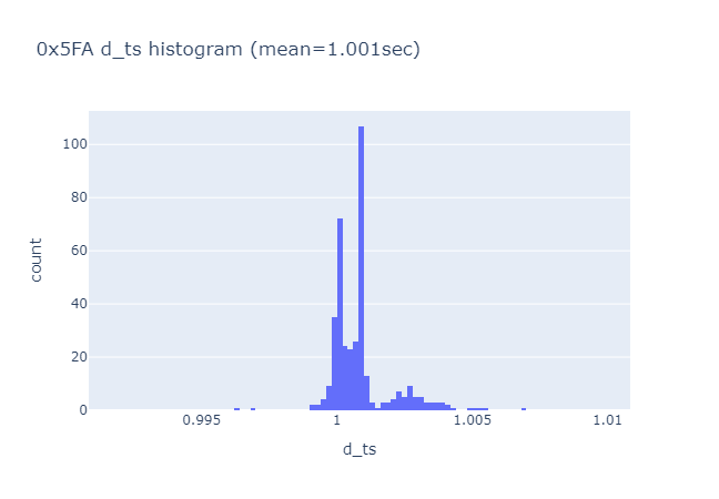 예상대로 전송 주기를 중심으로 매우 집중된 분포를 보인다.