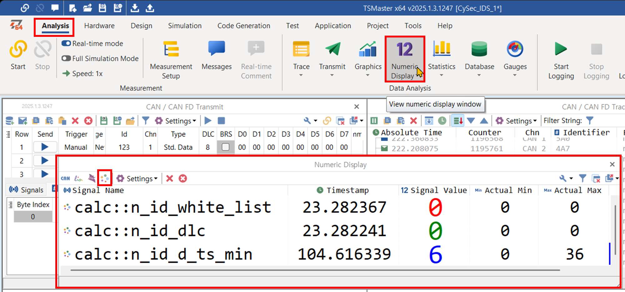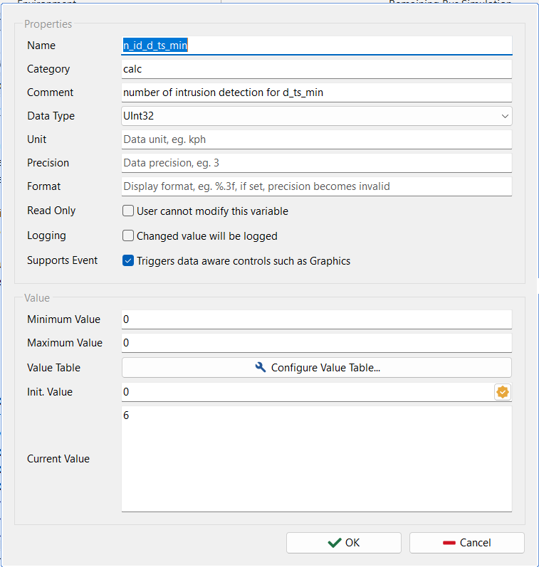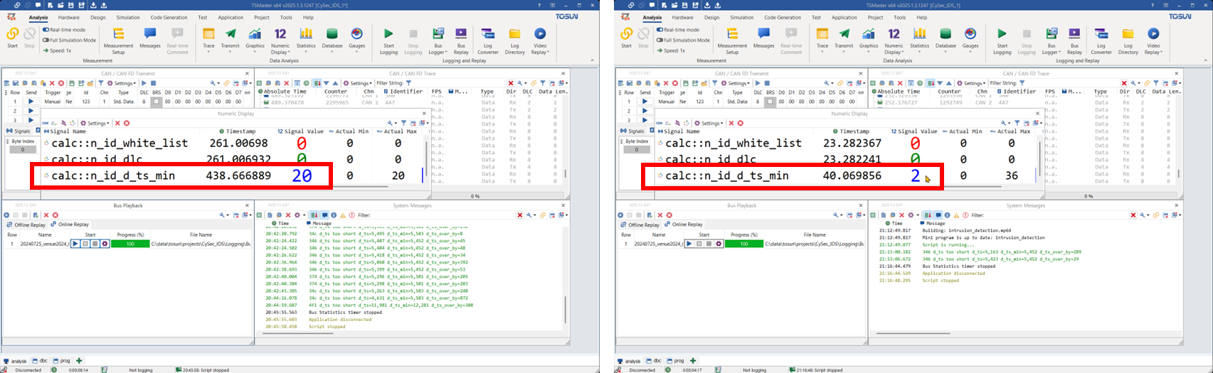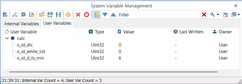 # d_ts가 기준보다 작으면, 즉, 메시지 간격이 너무 좁으면, 침입으로 감지한다. if d_ts < x[ACAN.id]['d_ts_min']: # 침입이 감지되어 카운터를 증가한다. n_intrusion_detection['d_ts_min'] += 1 # 침입 카운터 시스템 변수를 업데이트한다. app.set_system_var_int32('calc.n_id_d_ts_min', n_intrusion_detection['d_ts_min']) # 기준을 얼마나 초과하였는가? d_ts_over_by = x[ACAN.id]['d_ts_min'] - d_ts app.log_text(f'{ACAN.id:x} d_ts too short d_ts={d_ts:,} d_ts_min={x[ACAN.id]["d_ts_min"]:,} {d_ts_over_by=:,}', lvlOK)- 침입 감지 건수를 표시할 시스템 변수들을 추가하였다.