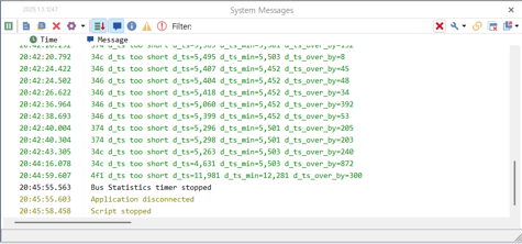 class RawCAN(): """ TSMaster TRawCAN """ def __init__(self, AId: int = 0, ADLC: int = 8, AIdxChn: int = 0, ATimeUs: int = 0, ADatas: typing.List[int] = [], AFlags: int = 6): ''' Create a raw CAN frame with identifier and dlc ''' def init_w_std_id(self, AId: int, ADLC: int) -> None: "initialize a RawCAN object with standard identifier and dlc" def init_w_ext_id(self, AId: int, ADLC: int) -> None: "initialize a RawCAN object with extended identifier and dlc" def set_data(self, AIdxByte: int, AData: int) -> None: "set raw data byte by index" is_tx: bool = "whether are tx signal" is_data: bool = "whether are data" is_std: bool = "whether status code are correct" is_err: bool = "whether are error" is_edl: bool = "whether is EDL function" is_brs: bool = "whether is BRS function" is_esi: bool = "whether is ESI function" idx_chn: int = "channel index" dlc: int = "dlc length of data" id: int = "identifier of frame" time_us: int = "Timestamp in microseconds" data: typing.List[int] = "Data bytes, Note: you cannot write single value here, use set_data or write whole array instead: data = your_array_object"- Rx 이벤트가 발생한 타임스탬프가 아닌, 메시지를 수신한 타임스탬프를 이용하도록 코드를 수정하고 시험하였다.