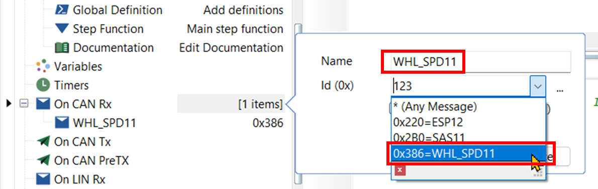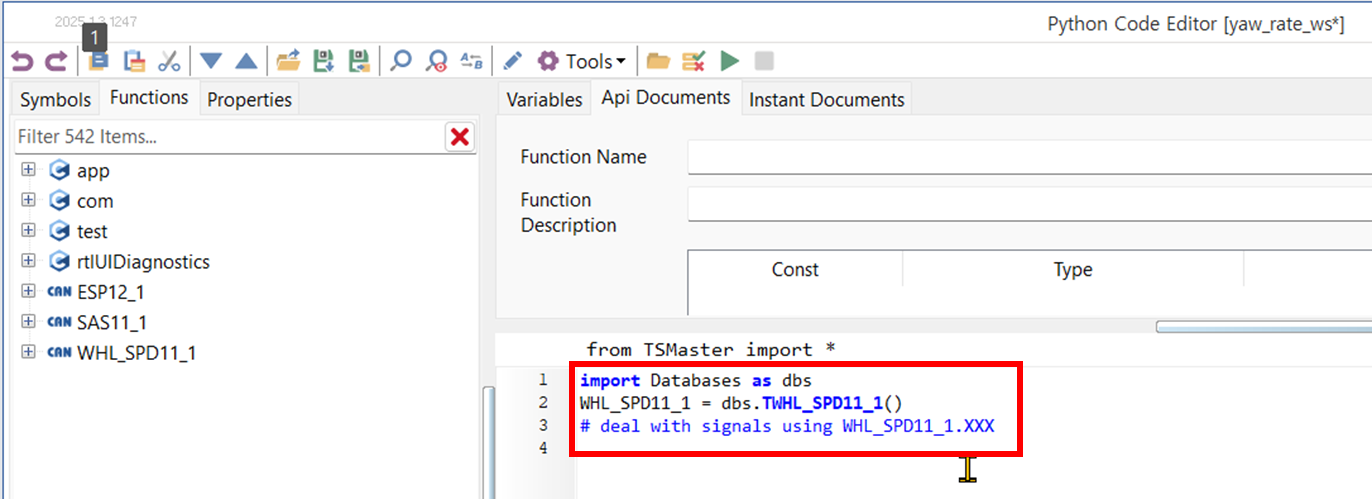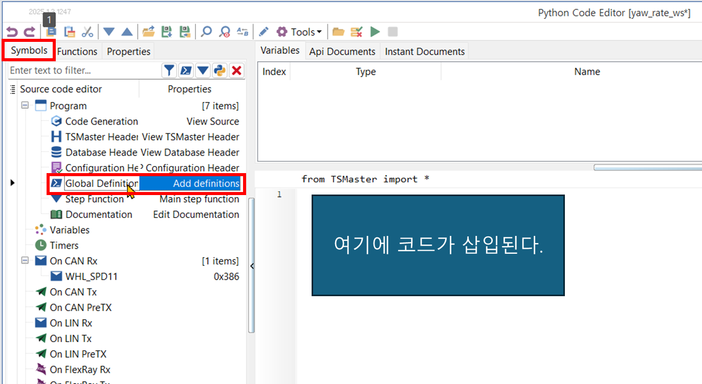 Global Definition에 메시지를 읽는데 필요한 코드가 추가된다. 코드는 Databases 모듈을 import 하고 글로벌 변수 WHL_SPD11_1를 정의 - CAN 메시지들의 정의가 있는 Databases 모듈을 import 한다.