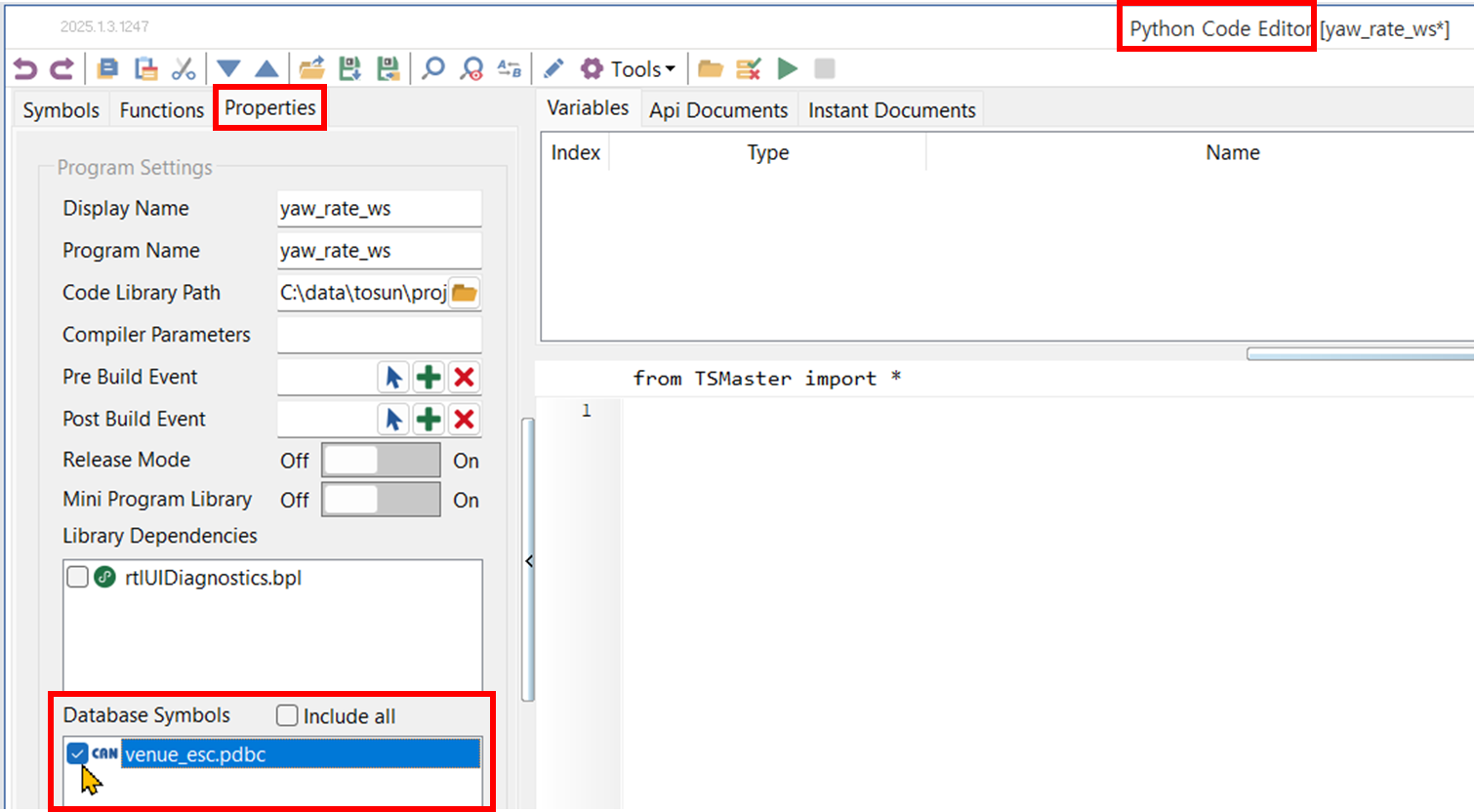 dbc에 포함된 메시지들을 코드에서 사용할 수 있도록 하기 위해 Properties 탭의 Database Symbols에서 dbc를 체크한다. - Symbols 탭을 클릭한다.