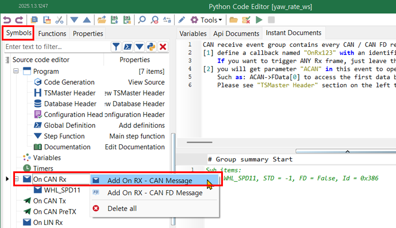 메시지를 수신할 때 신호를 읽기 위해서 On CAN Rx에 함수를 만든다. On CAN Rx에서 마우스 우클릭한다. 용도에 맞게 CAN 혹은 CAN FD를 선택한다.