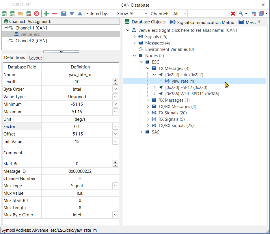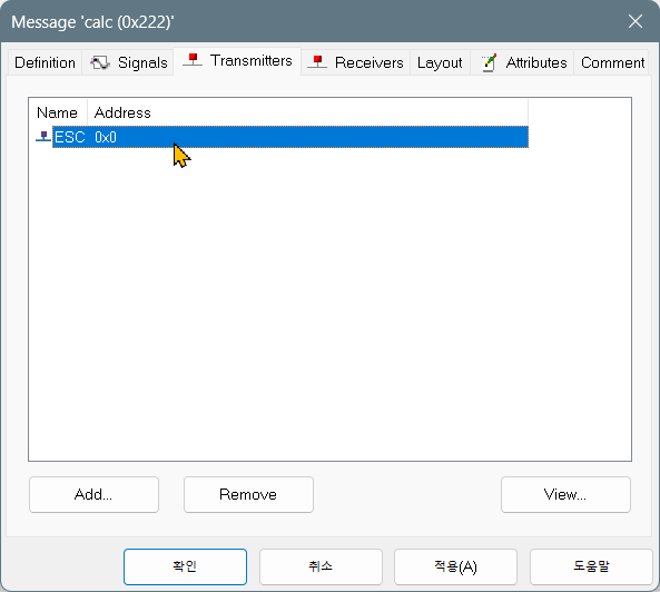 Layout 탭을 보면 데이터 영역에서 yaw_rate_m 신호가 차지하는 부분을 볼 수 있다. - 메시지를 제어기와 연결한다. 메시지 정의 창에서 Transmitters 탭을 선택한다. 아래쪽에 있는 Add... 버튼을 클릭하여 ESC를 선택한다. 이 메시지를 ESC가 보내는 것으로 가정했다.