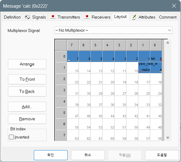 calc 메시지의 Signals 탭에서 Add... 버튼을 클릭하여 yaw_rate_m 신호를 추가한다. - 메시지 정의 창에서 Layout 탭을 선택한다. 아래 그림처럼 yaw_rate_m 신호가 전체 64 bit 중에서 상위 10 bit를 차지하는 것을 볼 수 있다. 신호의 위치를 변경하고 싶으면 신호를 드래그&드롭할 수 있다.