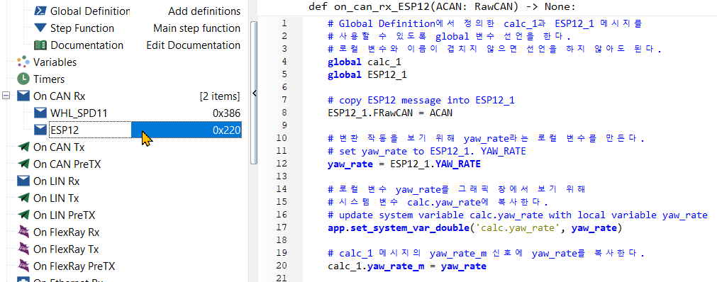 Global Definition에서 ESP12_1과 calc_1 메시지를 읽을 수 있는 오브젝트를 정의한다. - ESP12 메시지를 수신할 때마다 calc 메시지를 전송하기 위해 On CAN Rx에 ESP12 메시지 수신 이벤트를 추가한다.